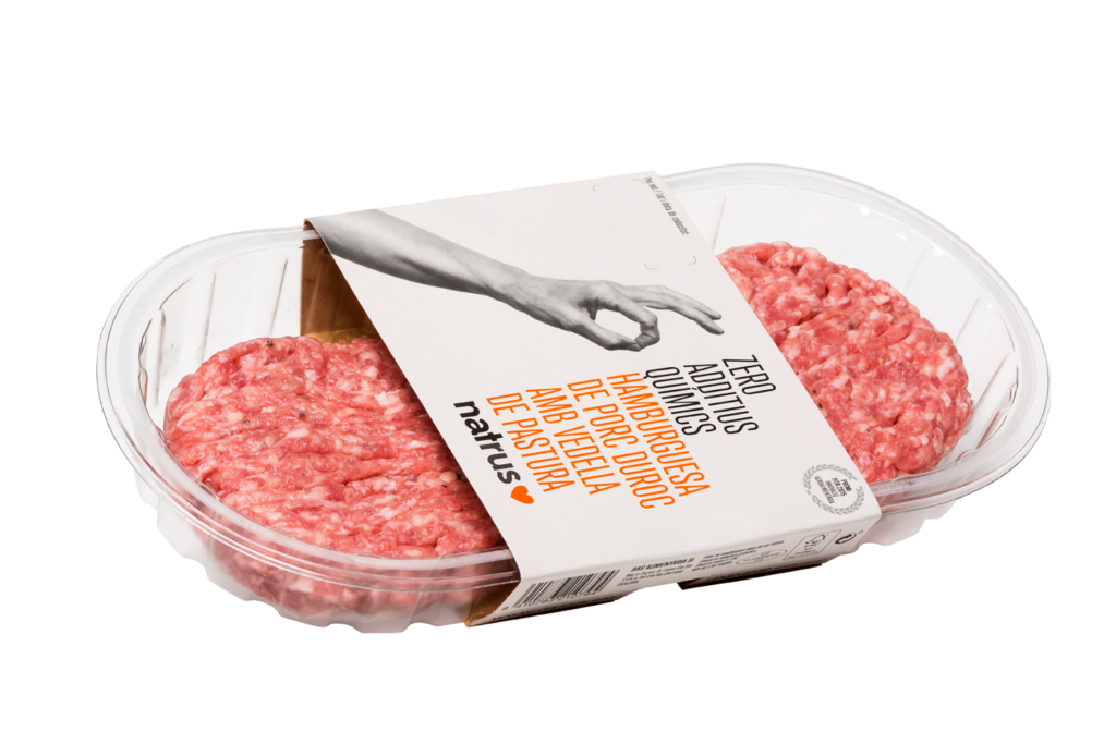 La nostra hamburguesa mixta està elaborada exclusivament amb carn de vedella de primera qualitat del Mas La Carrera de La Vall d’en Bas (Garrotxa), pioners a l’Estat en la introducció de la prestigiosa raça bovina Angus amb pedigree, i carn de porc de la raça duroc certificada per Noel Alimentària. Juntes formen una gran parella de ball. La seva textura de picat gruixut, a l’estil francès de l’steak haché, li confereix objectivament una tendresa incomparable, especialment si es tempera prèviament i es cuina al punt o poc feta. I, fidels a la filosofia de natrus, es tracta òbviament d’un producte 100% natural, és a dir, que no conté cap tipus d’additiu químic, ni tampoc presenta cap mena d’al.lergen ni de contingut d’aigua.